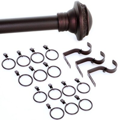 - The set includes one adjustable rod with two finials, three steel support brackets, and fourteen matching rings.